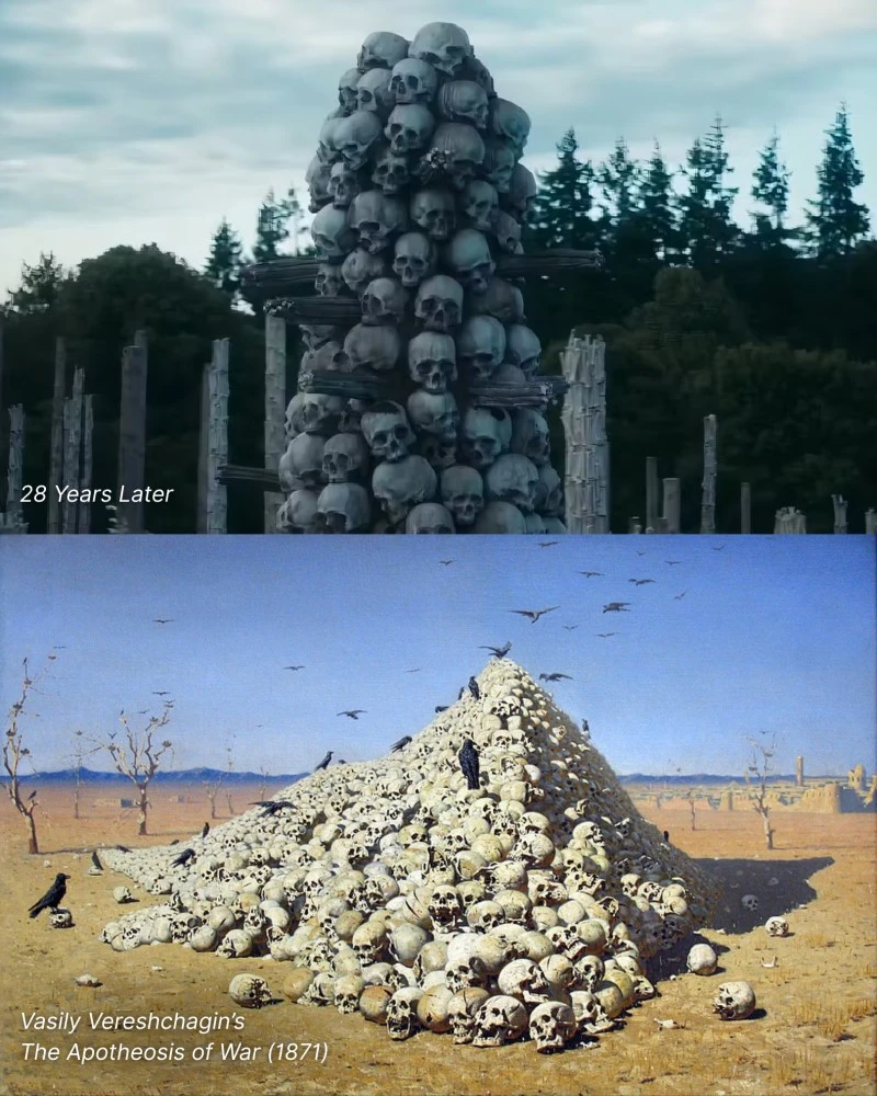В «28 лет спустя» одинокая фигура стоит перед горой черепов, прямое и жуткое воспроизведение антивоенной картины Верещагина. Верещагин посвятил своё произведение «всем великим завоевателям, прошлым, настоящим и будущим», и картина является суровым, жестоким памятником человеческой цене конфликта.