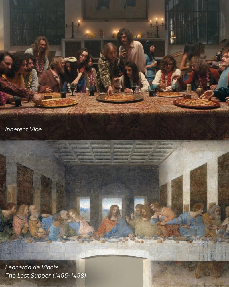 Пол Томас Андерсон мастерски поставил сцену в «Врожденном пороке», которая игриво, но в то же время точно воссоздаёт знаковую композицию Леонардо. Расположив свою эклектичную группу персонажей за длинным столом в форме, схожей с Иисусом и Апостолами, Андерсон создаёт момент сюрреалистического, мрачно-комического почтения.
