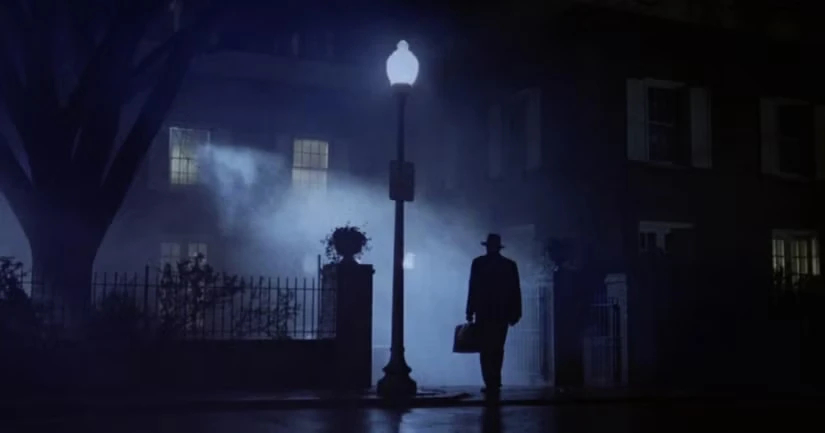 «Мы снимали ночные экстерьеры в Джорджтауне, и самым сложным был кадр, где сам Экзорцист прибывает к дому. Уже поздно ночью, и кадр начинается с камеры, направленной на пустынную туманную улицу. Две фары появляются из тумана — это такси, которое делает круг перед домом. Священник выходит и стоит в ярком свете. Получить такой яркий свет через затенённое окно было трудно, и нам нужно было удерживать эффект тумана по всей улице. Конечно, как назло, когда мы были готовы снимать, поднялся ветер, что усложнило удержание тумана. Но мы снимали быстро и смогли поймать сцену».