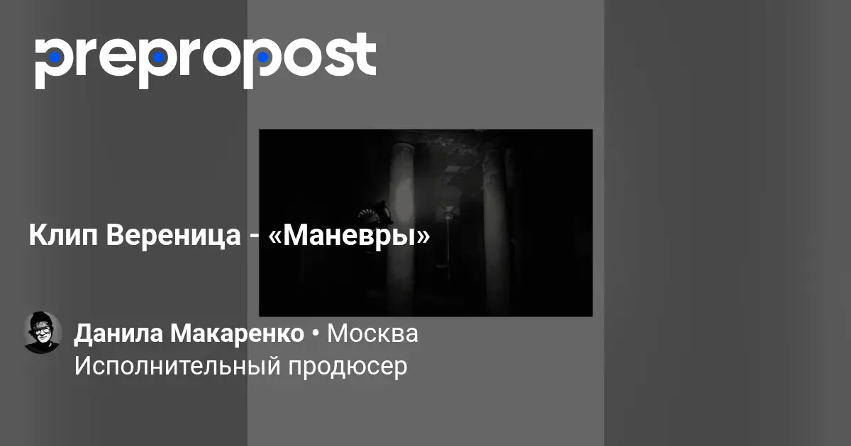 Клип Вереница - «Маневры» DIR: Илья Русинов 1st AD: Милана Воронина DOP: Дмитрий Галицкий PROD: Полина Панферова PROD: Арсений Ермаков 1АС: Данила Макаренко 2AC: Андрей Коротков GAFFER: Максим Иовенко Spark: Петр Клоков, Максим Евдокимов